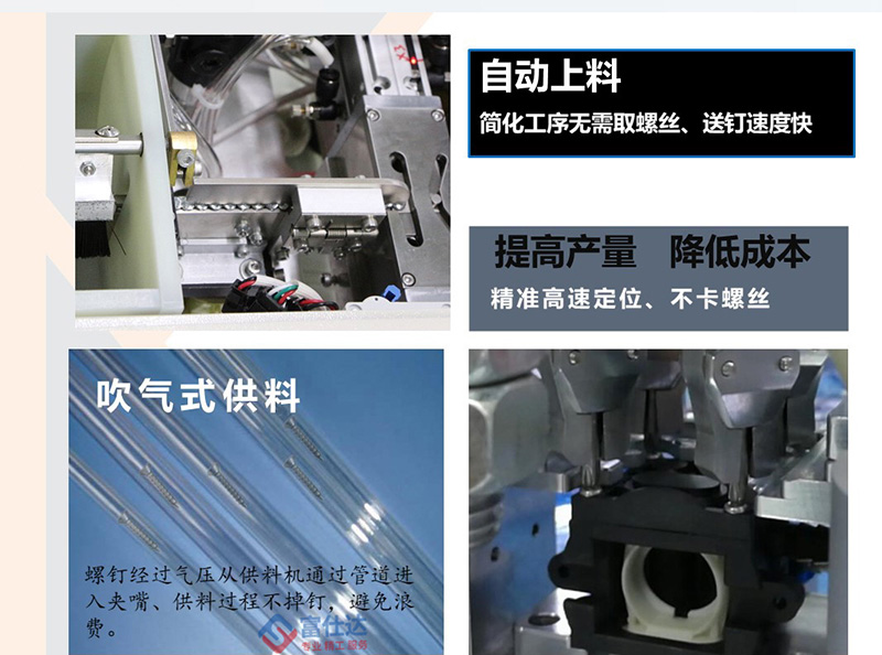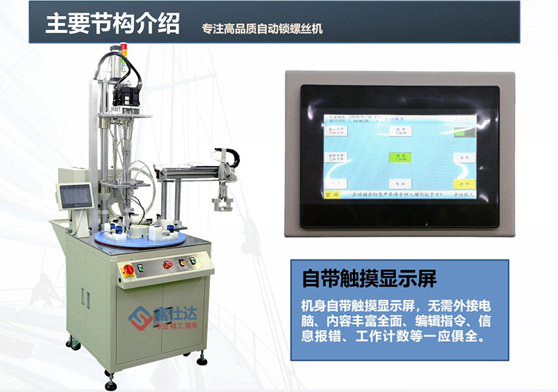 轉(zhuǎn)臺(tái)式自動(dòng)鎖螺絲機(jī)主要由多軸鎖付系統(tǒng)、自動(dòng)送釘系統(tǒng)、同步作業(yè)臺(tái)、PLC控制系統(tǒng)等組成,設(shè)備根據(jù)產(chǎn)品生產(chǎn)要求定制送釘系統(tǒng)及鎖付系統(tǒng),可實(shí)現(xiàn)一次輸送并擰好多顆螺絲的效果,通過(guò)設(shè)計(jì)同步作業(yè)臺(tái),增強(qiáng)人機(jī)互動(dòng),多工序同步進(jìn)行,提升效率。日常操作中,作業(yè)員僅需不停取放產(chǎn)品即可,設(shè)備自動(dòng)輸送螺絲、自動(dòng)擰好所有螺絲。