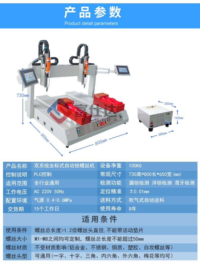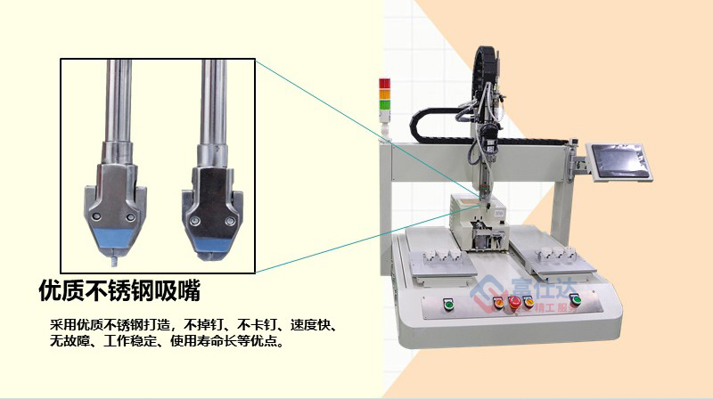 雙系統坐標式鎖螺絲機具有坐標式所有優點,不同的是雙鎖付系統采用兩臺獨立的自動送釘機和電批,分別用PLC控制各自電批的工作路徑,一臺設備可同時完成不同產品的螺絲鎖付工作,也可完成同一產品不同部位螺絲的鎖付工作,設備功能與普通坐標式自動擰螺絲機類似,搭配觸摸屏即可操作,可自行更改鎖付路徑。設備功能更完善。
