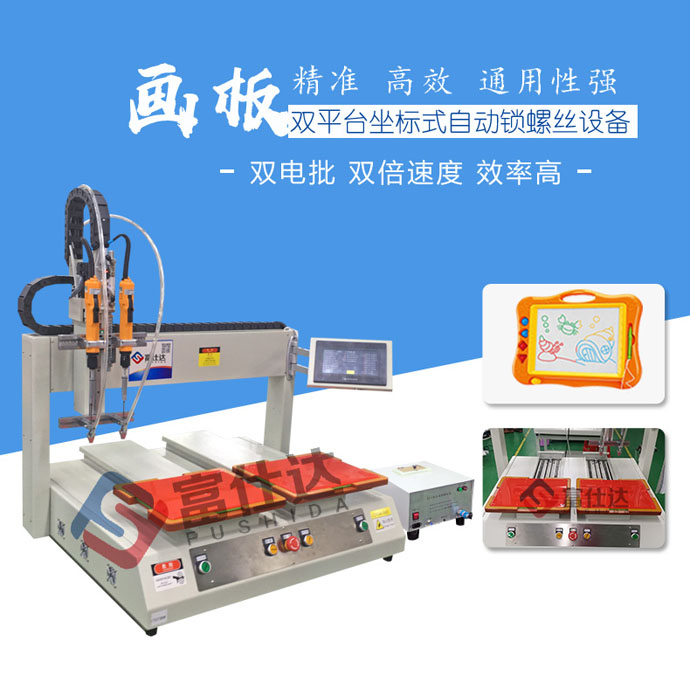 兒童畫板自動鎖螺絲機采用富仕達雙平臺坐標式,配置2把電批一次同時擰好2顆螺絲,效率提升2倍,設計可調式夾具,滿足多產品生產要求。