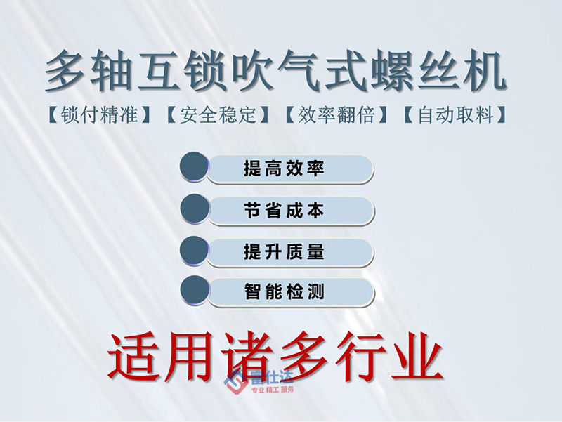 該鎖付系統可等同為全自動鎖螺絲流水線,通過四個工作站的作業,將百葉窗扇葉通過螺絲緊固在框架內的指定位置,螺絲采用自主研發吹氣式自動送釘機,直接輸送至鎖付機構;扇葉通過專用治具與框架定位,需手動放置;鎖付系統采用水平雙方向同時作業,配置4把電批位于兩側,一次擰好4顆螺絲;移動式作業臺根據程序設定,逐點向前推進并自動擰螺絲。